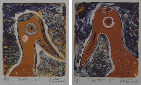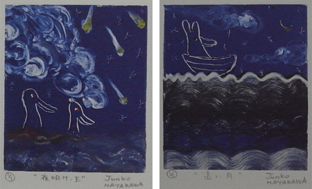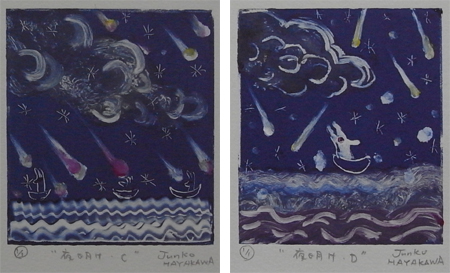 早川さんの1994年に多摩美術大学油絵科を卒業、1997年に同大学院の版画専攻を修了され、版画作品や絵本を数多く手がけています。今回の展示では木版画やモノタイプ、絵本などが展示されているのですが、モノタイプの作品に気持ちが強く惹かれてしまいました。